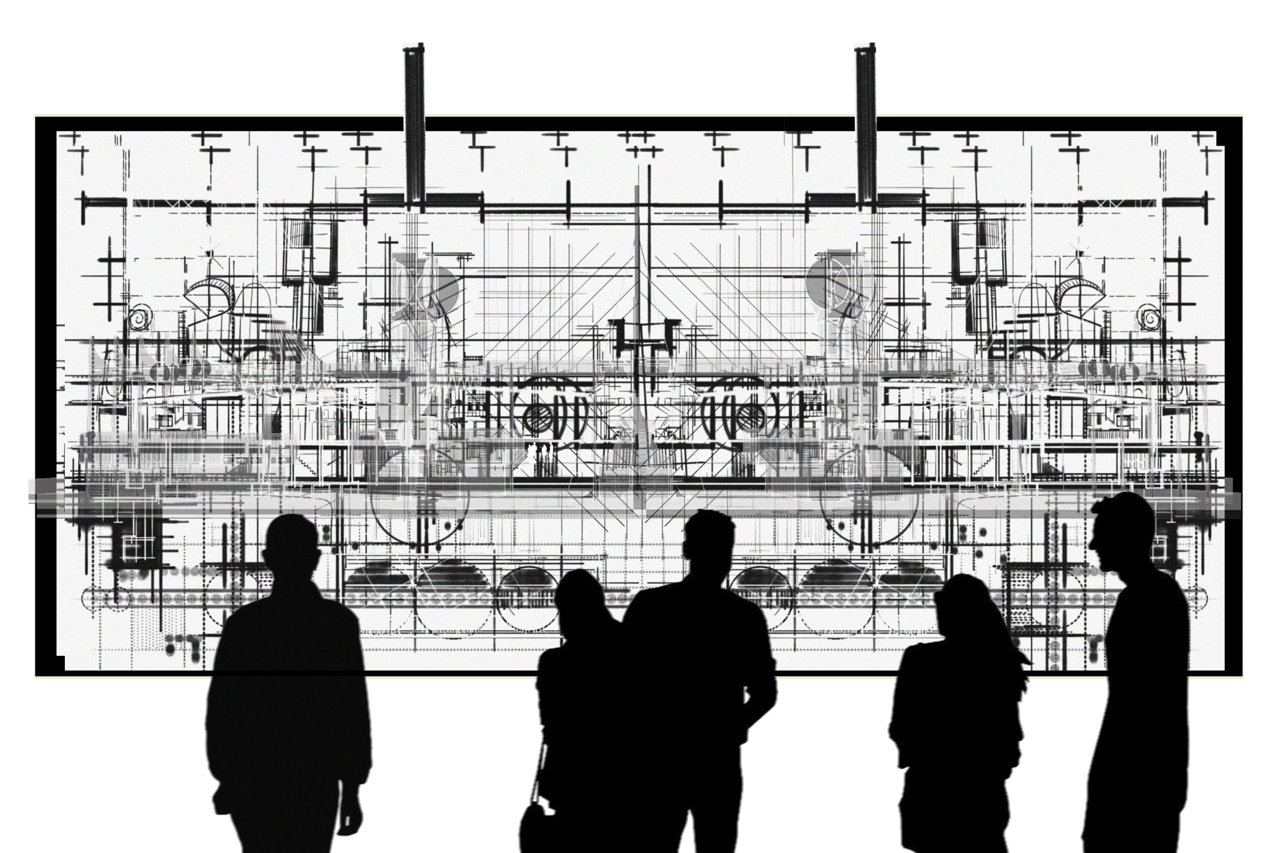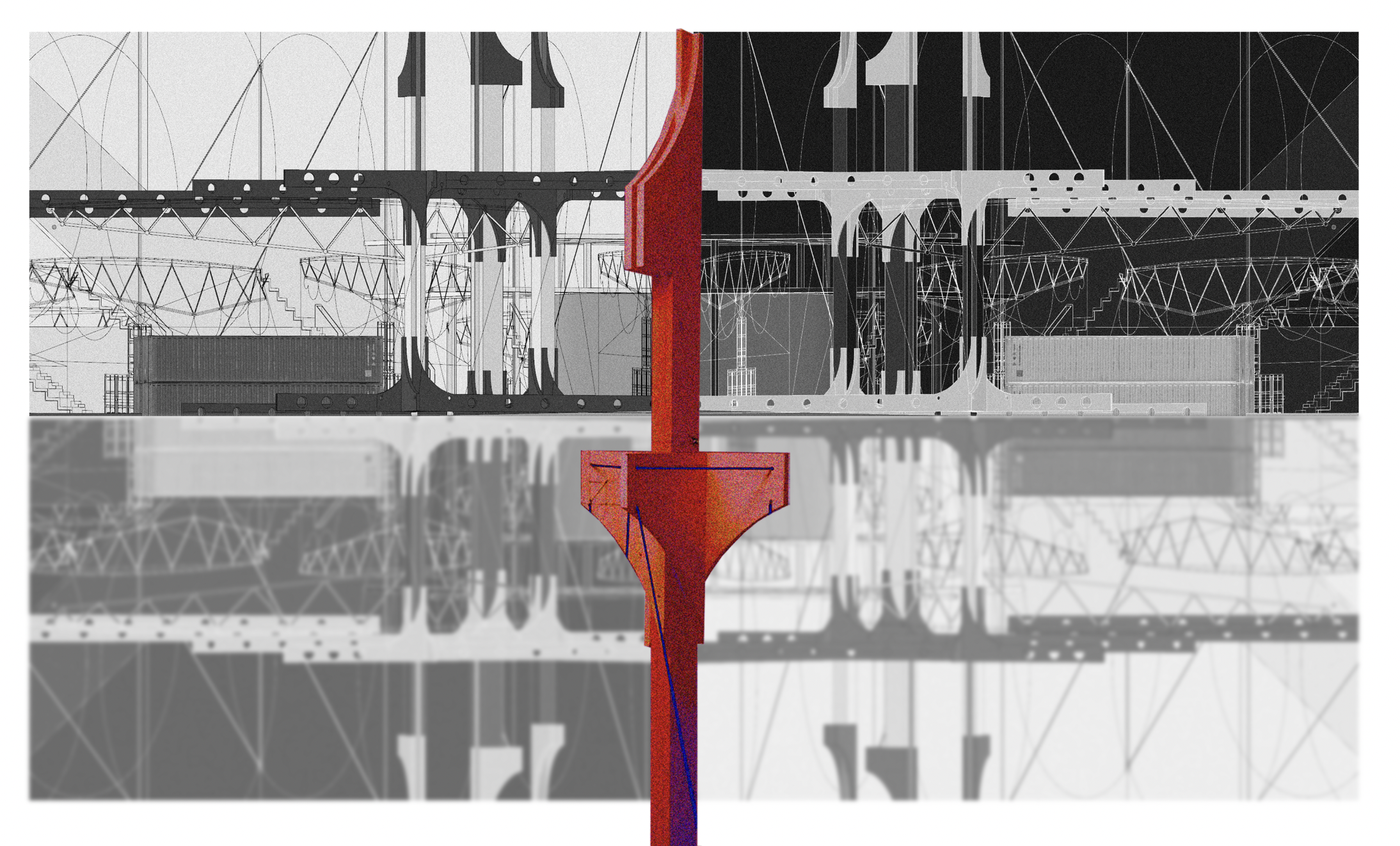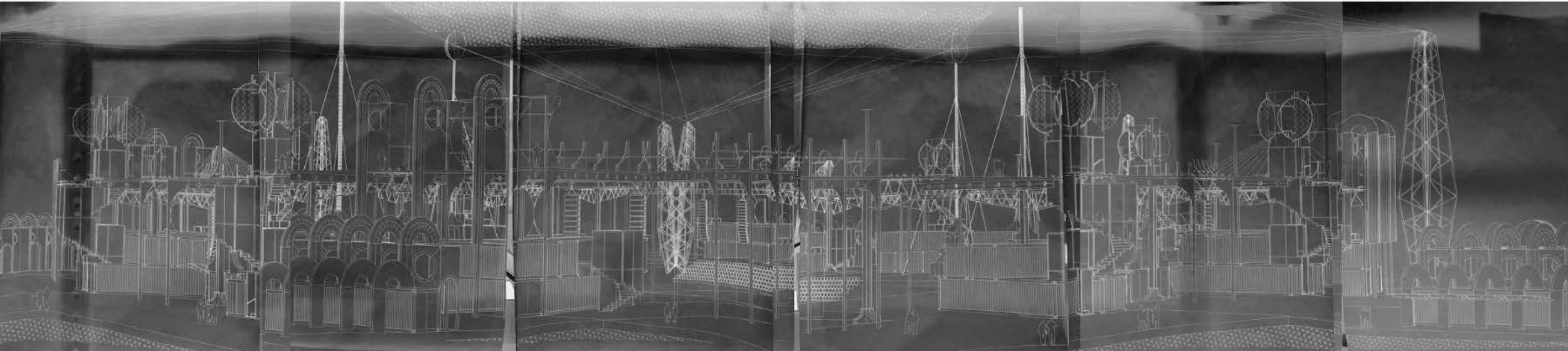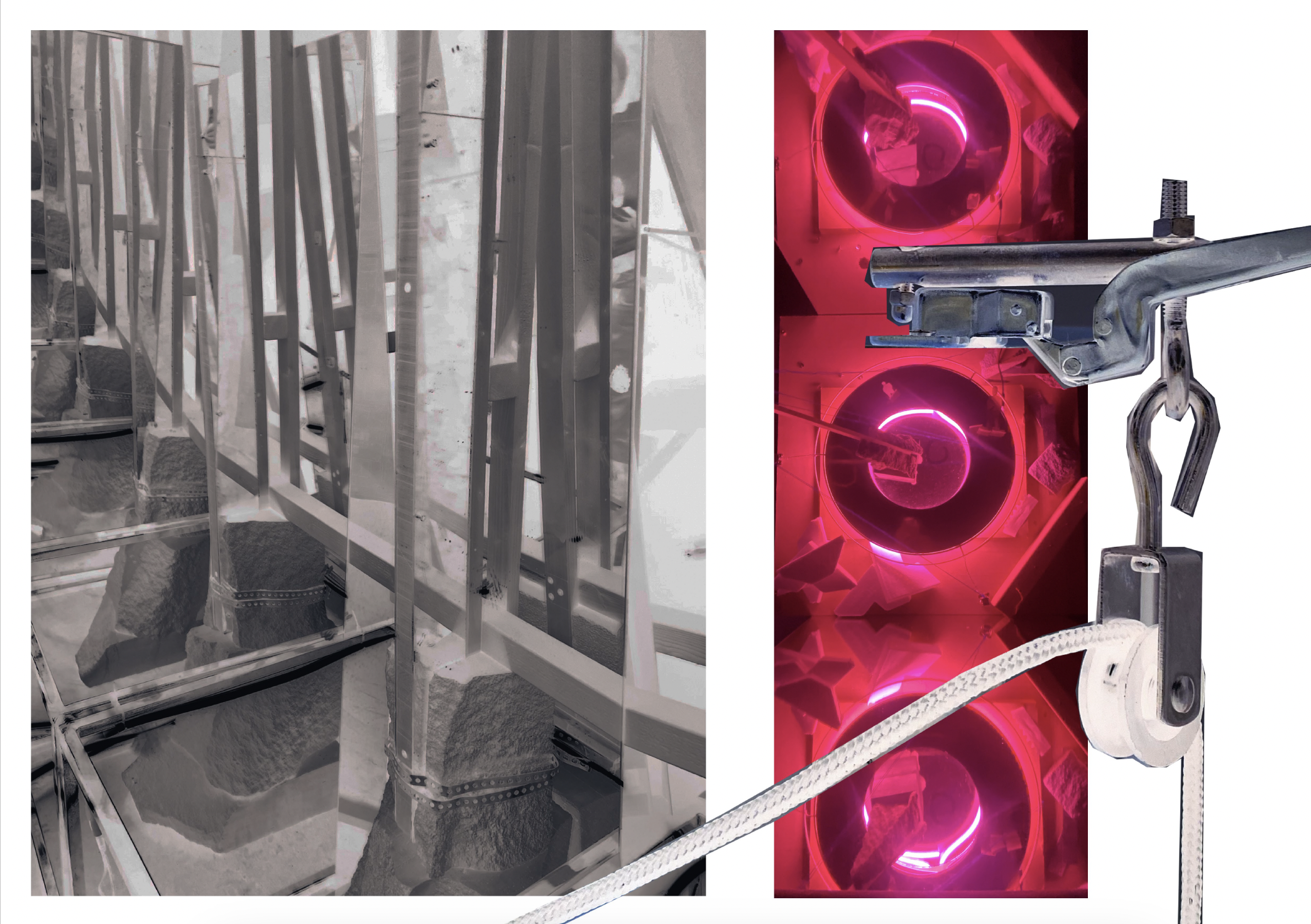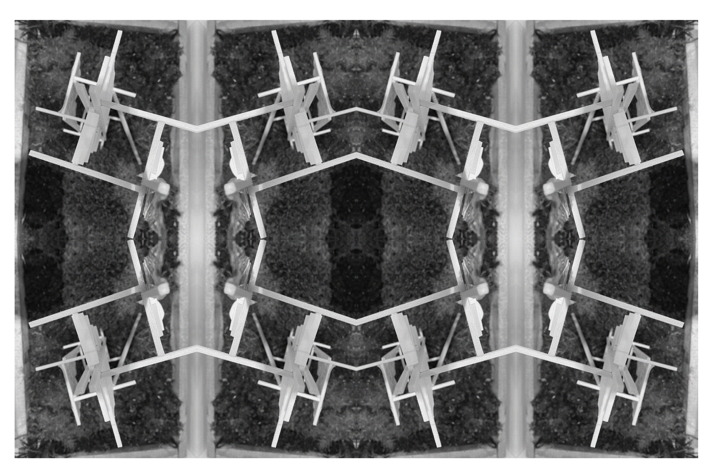 understood as column, 4 offset plywood pinwheel curves, channeled and mirrored with 5mm black rope, strung between the repeated offset