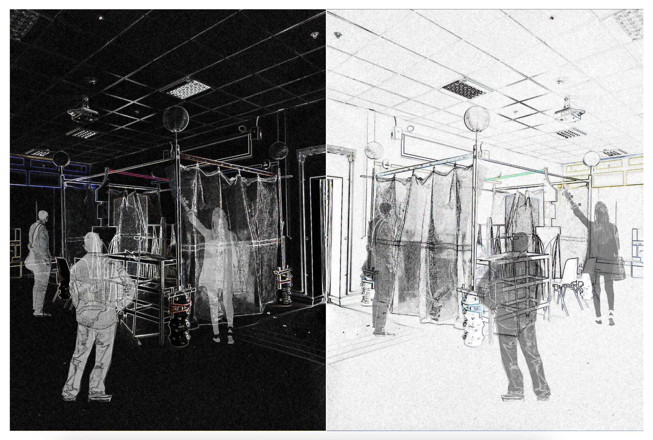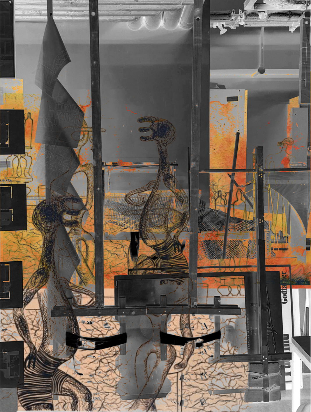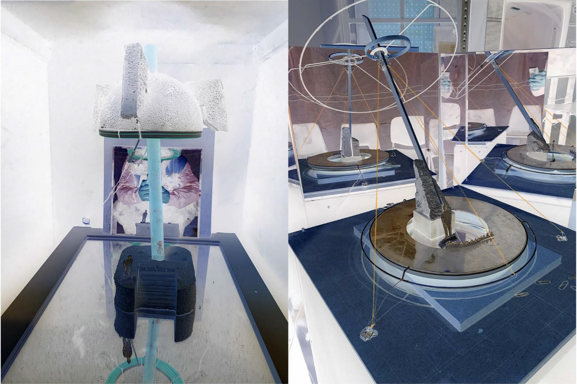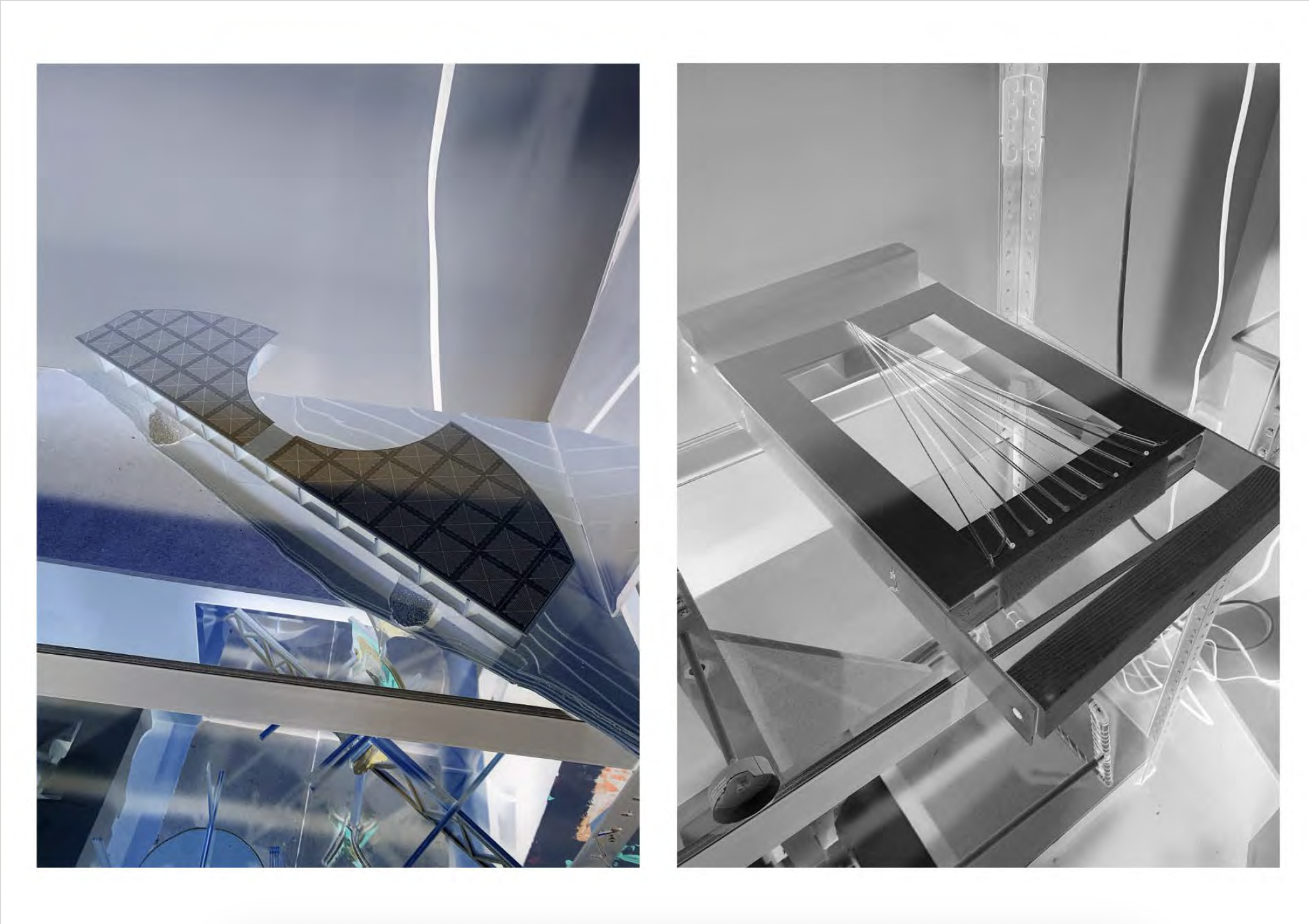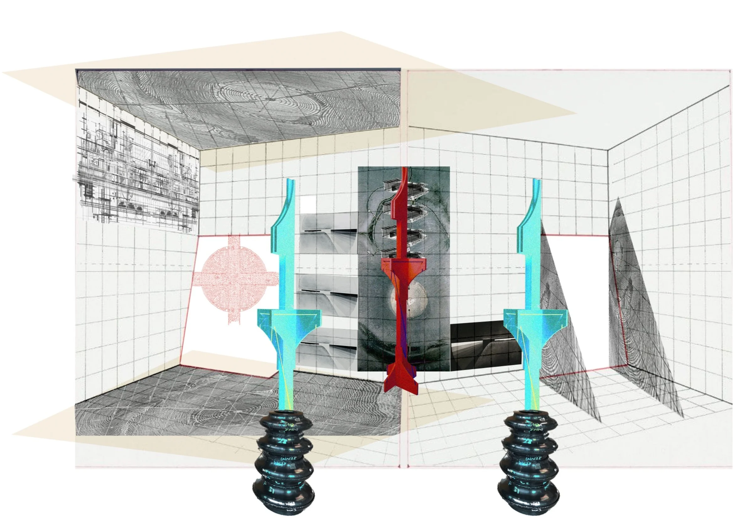 understood as column, 4 offset plywood pinwheel curves, channeled and mirrored with 5mm black rope, strung between the repeated offset
